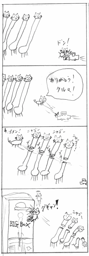 「ネコマン」の次のマンガのアイデアを考えてるんですが、いっこうに何も思いつきません。思いついたフレーズといえば「ネコvs力士」だけです。ひどいですね。困るとすぐに力士を持ち出すクセは早く直したほうがいいと思っています。
