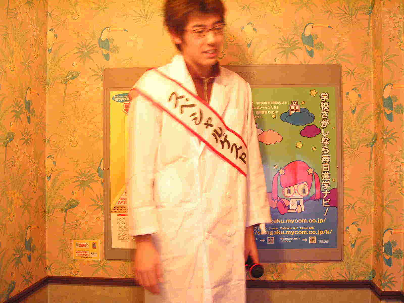 | 独り遊びのススメ 音声解説・・・クリックしてください。それぞれの項目を説明していきます。声小さくてすいません。 −独りカラオケをやってみよう初心者編− 用意するもの: ・衣装 (今回の場合は白衣、) ・たすき 今回の場合は「マイクは離せません」と「スペシャルゲスト」) ・その他演出のための小道具 (メガネ、つけヒゲとかカツラ) ・デジカメ (セルフタイマーで) ・目薬 (眠気覚まし、目の疲れ防止) ・筆記用具、メモ帳 (自分の歌った曲をメモするため) ・携帯電話 用意しなくてもいいもの: ・ドアの外から見える部分を隠すためのもの ・エロ本 ・マイクスタンド ・母の写真あるいは家族の写真 機種: サイバーダムが妥当(マイナーな曲もあり) ![]() 諸注意: ・あらかじめ家を出る前に歌う曲をチェックしておく ・バラードばかり歌わない ・最初からのどを酷使する歌を歌いすぎない ・うまくテンションを上げる(声援やたすきなど) ※他に何かあれば追加していきます。 |